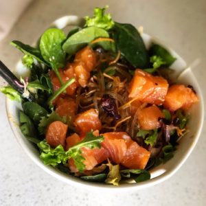 lunch- sweet potato glass noodles, veggies and salmon poke from Nancy’s Sky Garden (one of my fave spots in town)
