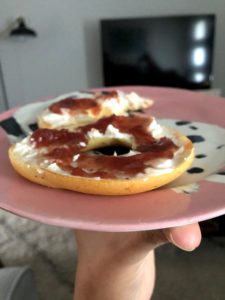breakfast- O’Dough’s bagel with vegan cream cheese and jam