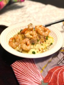 I made the grits by boiling a bag of cauliflower florets and blending them with 1/3 cup of beef broth, 1/4 cup nutritional yeast, 2 garlic cloves, half a shallot, crushed red pepper and salt. I then added the pureed sauce on top of steamed riced cauliflower bits. I added grilled shrimp and chopped chives – soooo yummy!!